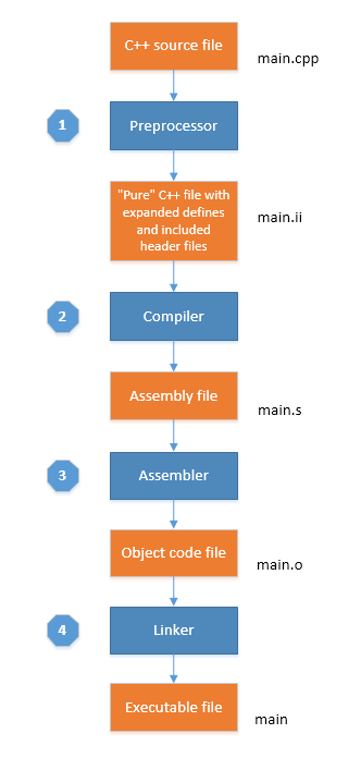 C++编译器通常进行以下4个步骤将源代码编译为可执行程序:
