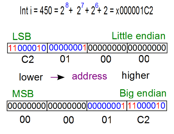 大端(Big-Endian)和小端(Little-Endian)是指字节在内存中的存储顺序: